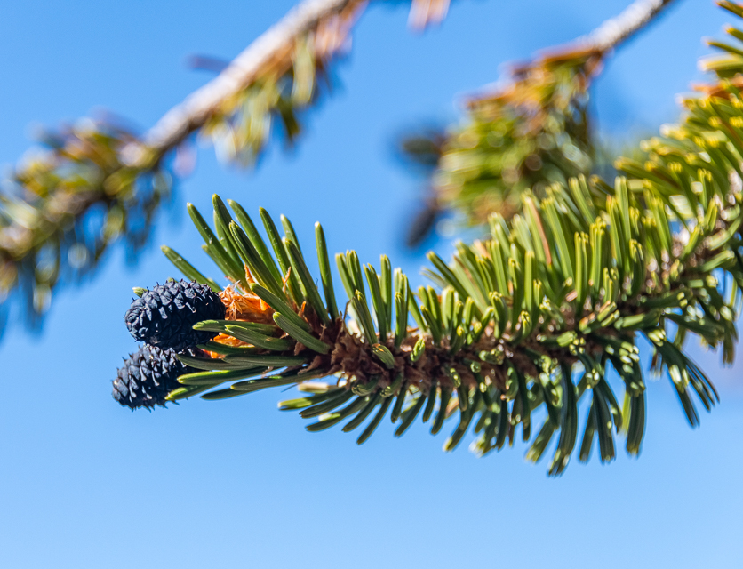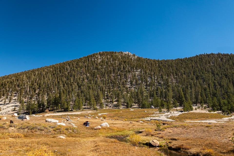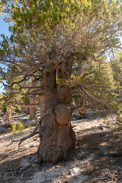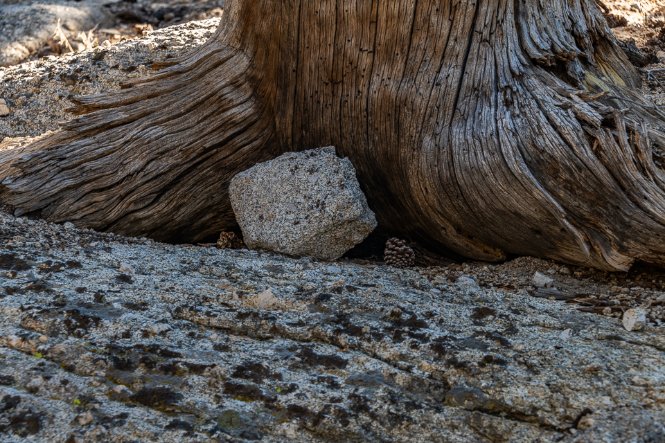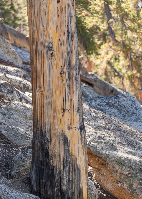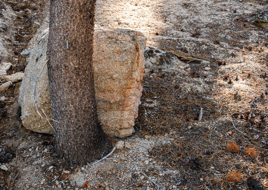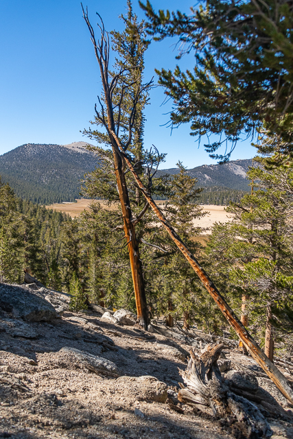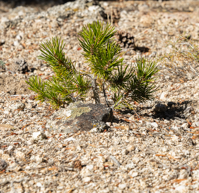 Before we left on our October road trip, Mary learned about the rare foxtail pine trees that are found in the southern Sierra mountains. They can live for over 2000 years! There is another subspecies that lives in the Klamath range in northern California. She found a location not far from where we were camping and made a GPS route on her phone for us to follow to find these unusual trees. We drove up a long (paved) road high in the mountains and once again we were around 10,000 feet! From there we had to drop down a steep road bank and then cross a meadow with a lovely meandering stream and then climb the steep ridge on the other side. The ridge was made up of pumice-like ground up granite and boulders. Not great walking, for sure. As we started up it, we commented on the lodgepole pines – so different from the lodgepoles in the Cascades and Rockies. Instead of being skinny trees growing in dense forests, these were open grown and large and had some character to them. I turned around and I saw a tree with much different bark! There it was! The elusive foxtail pine! We had barely climbed the ridge at all! As we looked some more, we could see they were everywhere! We continued to walk higher and higher, seeing more foxtails and fewer lodgepoles. After we’d had our fill, we returned to the meadow and then back up to the road where we found there were foxtails everywhere! We had been so determined to get to our starting point that we had not even looked around! It was a great adventure.