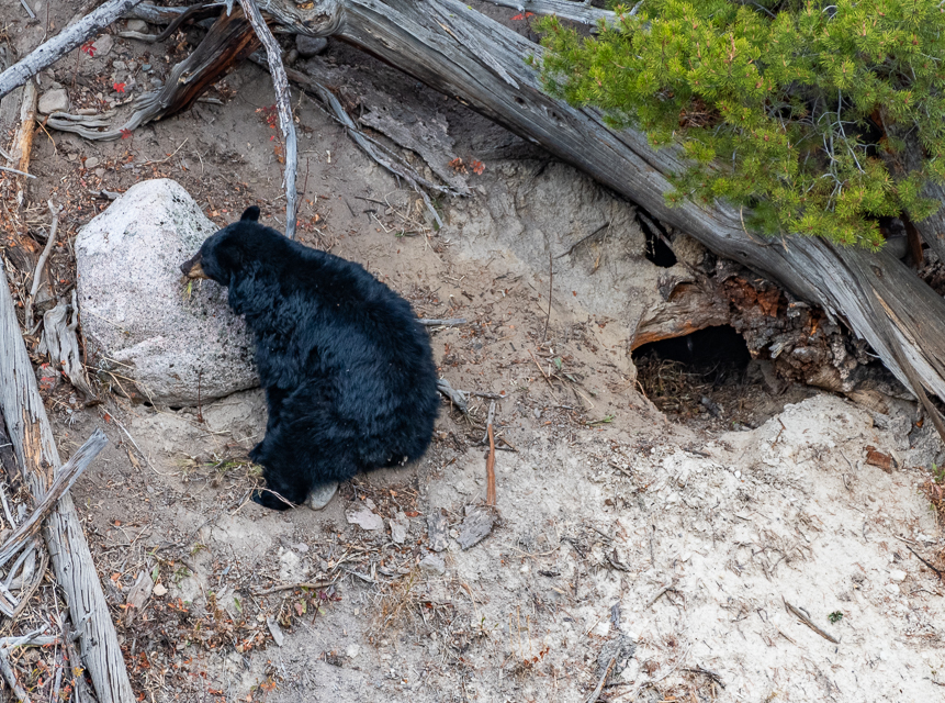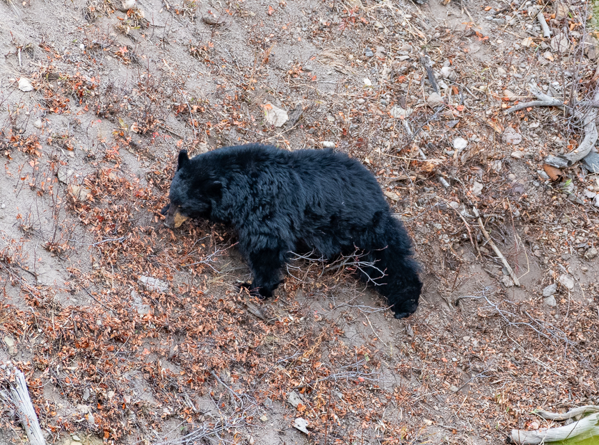 We were thrilled to see wolves hunting, eating, resting, playing and moving across the landscape. Overall we saw four different packs and three wolves from a not yet identified pack. Most of the sightings were through a spotting scope on distant hillsides. The Lamar pack had a carcass across a meadow, estimated at 300-400 yards away from the roadside where we waited to see them for hours. At last, near dusk when many of the wolf-watchers had left, they emerged to eat for a while before melting back into the woods.