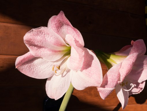 This time of year flowers are few and far between. Some low-lying dryer parts of the state may have some buttercups and grass widows but here on my hill they remain snow-covered or encased in mud. Blooming house plants do bring some color inside, sometimes unexpectedly. According to The Amaryllis Bulb Company, these plants can bloom from December through June. I had always considered them to be Christmas flowers and wondered why I could not get them to re-bloom during the holiday season. This particular plant also bloomed last summer when it stayed outside on the deck. When fall came, I put it in the coolest room in the house and quit watering it. After it lost all of its leaves about a month ago, I began to water it again. It sent up a flower stalk right away and has been blooming this week. The flowers are stunning and they seem to be calling out to be pollinated. Maybe I should go see if Ken’s bees are awake and if they are interested. Or not. This plant was my mother’s. She had received it as a gift. I have been caring for it for nearly seven years now. Hard to believe she’s been gone that long.