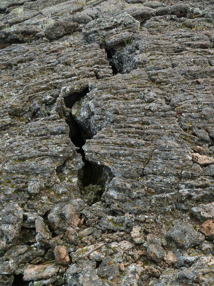 Ripples of lava hardened to basalt rock covered with mosses and lichens.