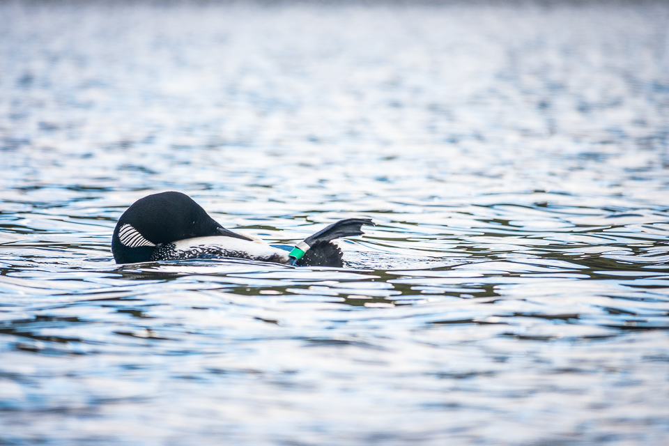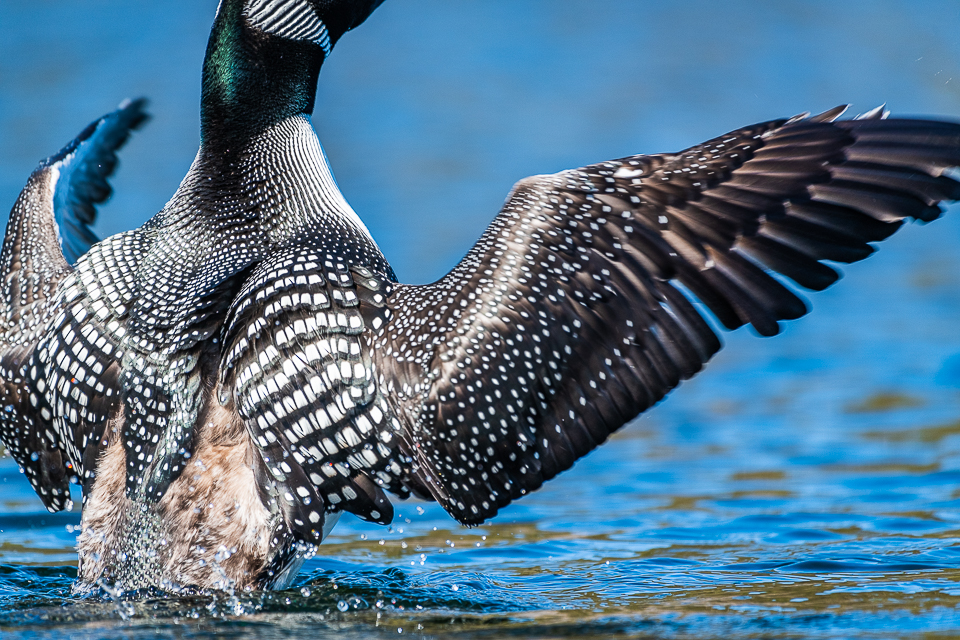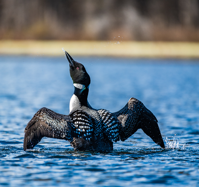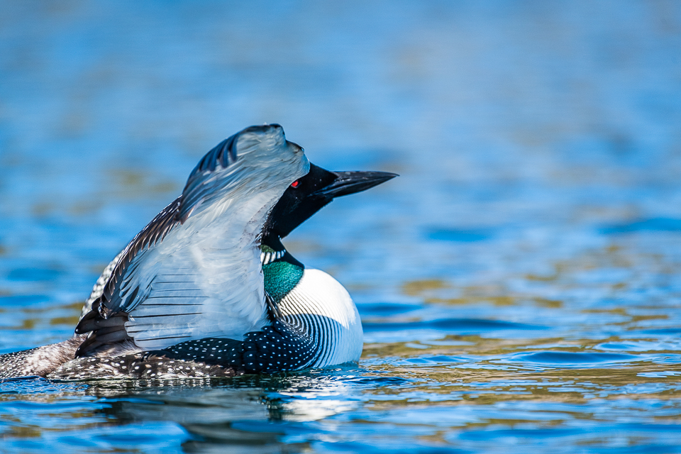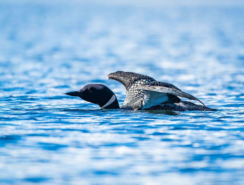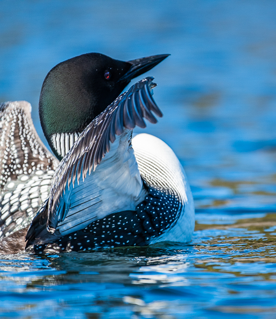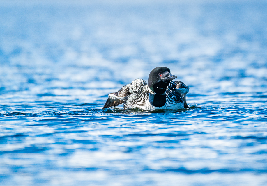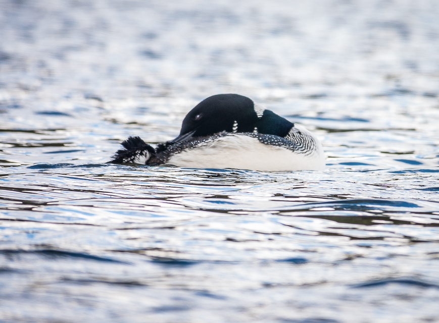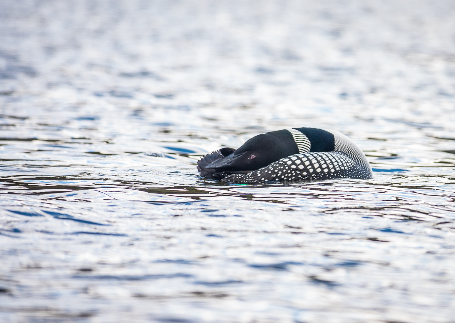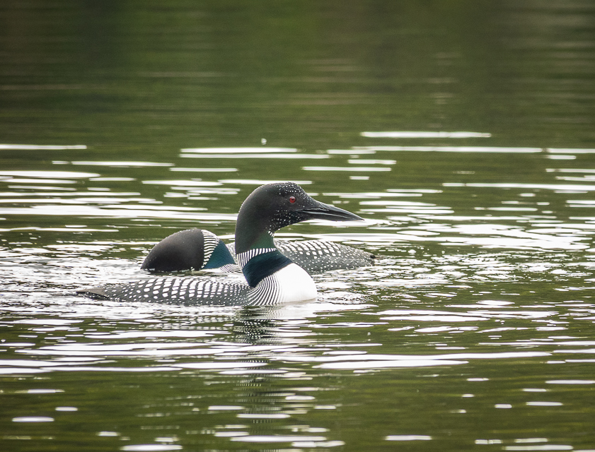 In the first photo, I thought the bird was sleeping but on closer inspection, you can see the red eye watching me. Both birds were resting in the middle of the lake so I moved on in my kayak, looking at other birds and enjoying the day. I paddled back into a marshy area where I often see Ring-necked Ducks and American Coots and if I’m lucky, I get good views of tiny warblers too. This time I found both Common Loons in the shallow water. I kept my boat as still as possible and they both approached me, diving often and popping up in front or behind me. It was exciting to watch them underwater! They never seemed to come up with food so I don’t know what they were doing except maybe showing off? They did not appear distressed and they did not make any calls. They were very interested in a patch of cattails and I wondered if it was even possible that they had a little one stashed in there, hidden from danger but I never saw any movement in the vegetation. Perhaps they were just enjoying a rare sunny spell.