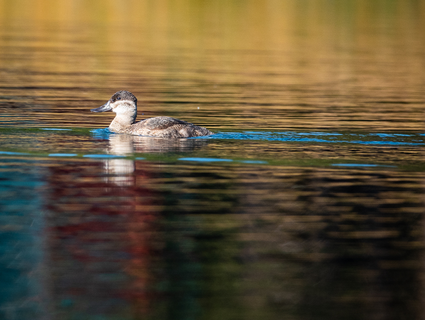 The pair of Ruddy Ducks tried to fool me. I had seen and identified them from shore by their small bodies and stiff, upright tail but when they initially went by my boat, they had their tails tucked in the water and I was puzzled! Then, in unison, they flicked their tails up as if to point out my ignorance. Very cute.