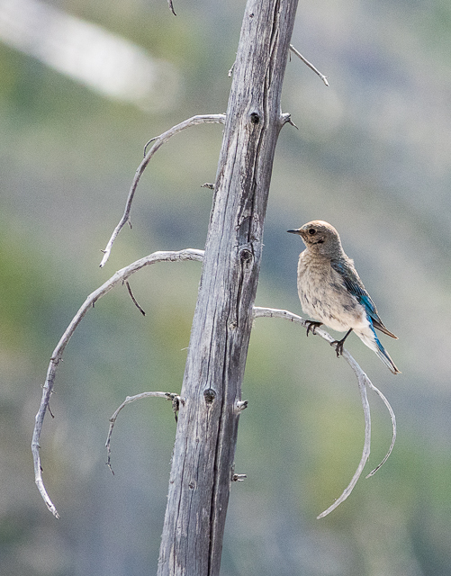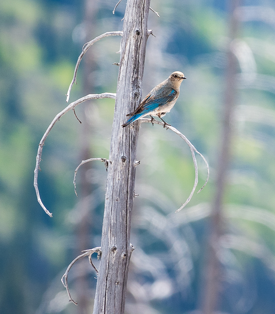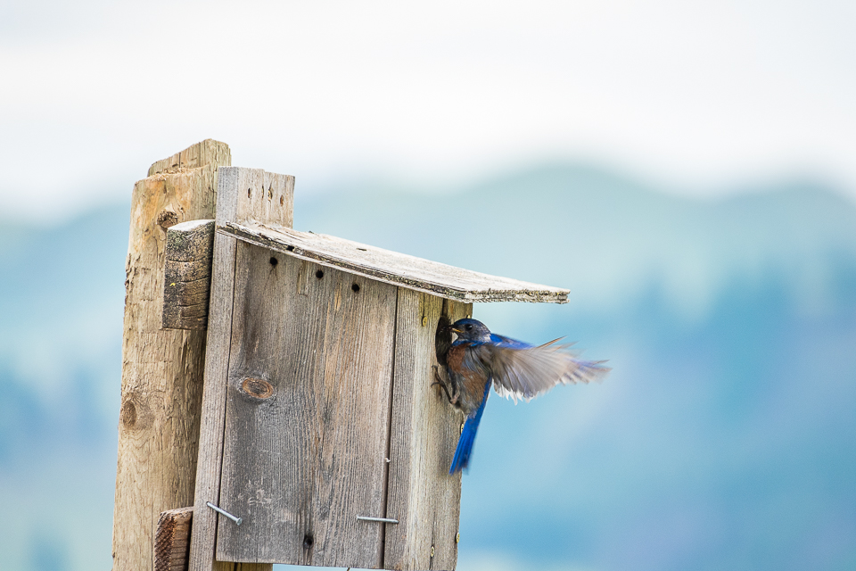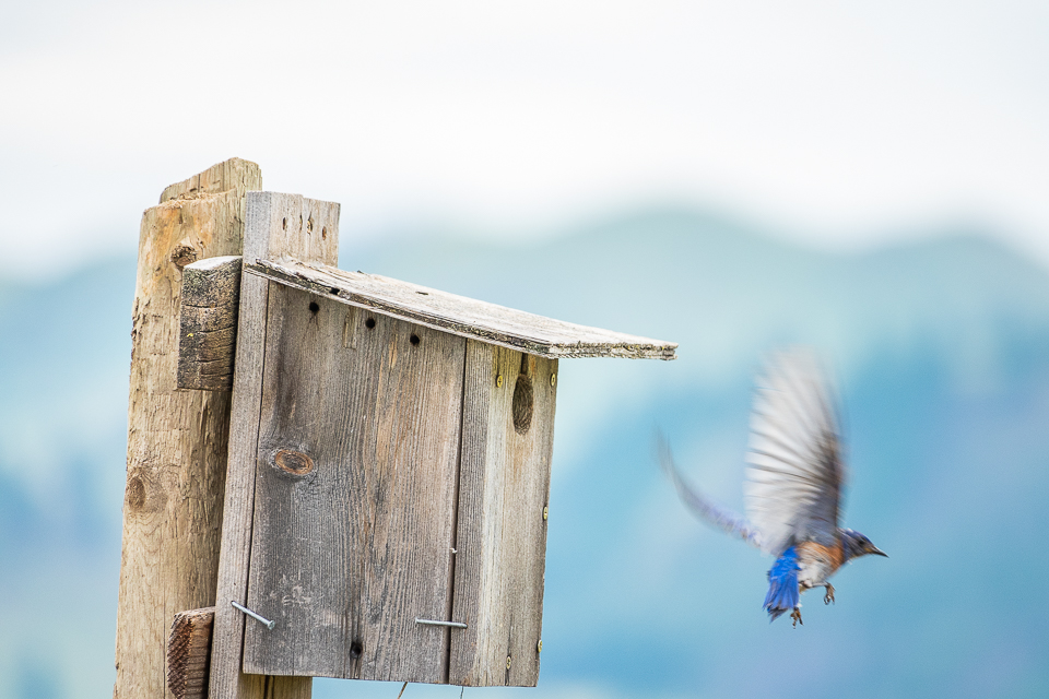 Speaking of motherhood, and fatherhood, a pair of Mountain Bluebirds has chosen one of our nest boxes to set up housekeeping. This is very exciting! Normally both Mountain and Western Bluebirds nest reasonably far away from our house so we see them only on our walks or at the bird bath. The box they’ve chosen is attached to the bottom of our deck and easily seen from inside the house and from the porch so we get to see them often. The Violet-green Swallows who have traditionally used this box are not happy.
