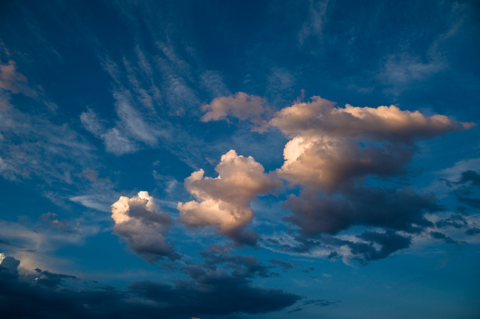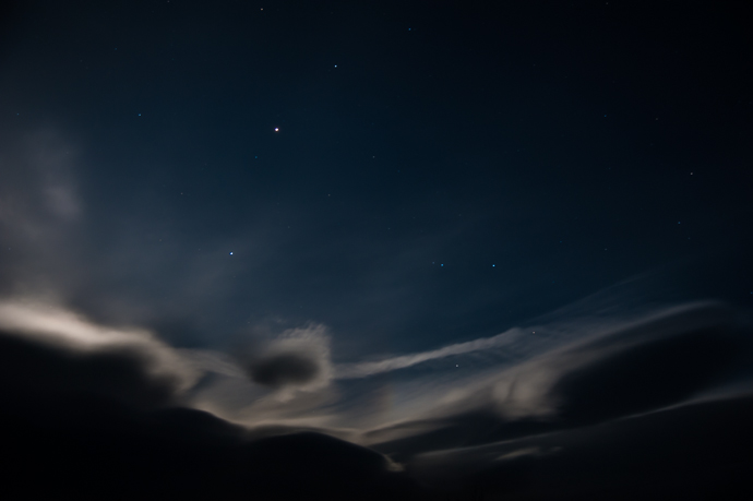 It’s good to go outside with the dogs at night. Sometimes they see something, like a deer, that brings on a fit of barking and they need to be corralled. Other times I see something interesting. Last night it was the clouds. They were thin and illuminated by the waxing moon that was low in the west. These views are looking north. The dogs went inside long before I did.