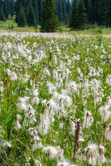 Last summer I saw photos of cottongrass growing in meadows in Montana and I thought I really need to go see those places! Earlier this summer, I saw a small patch of cottongrass on one of my hikes in a small wet meadow and it made me think about a large wet meadow that I like to visit. Fortunately I was there earlier this month and indeed, there was cottongrass, lots of it! Why haven’t I noticed it before?