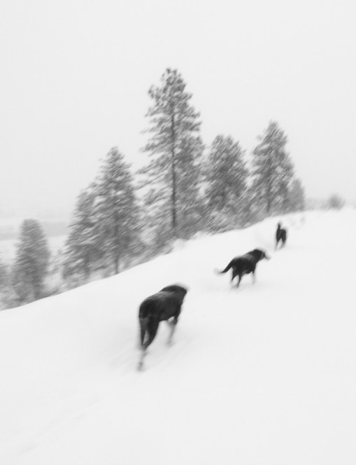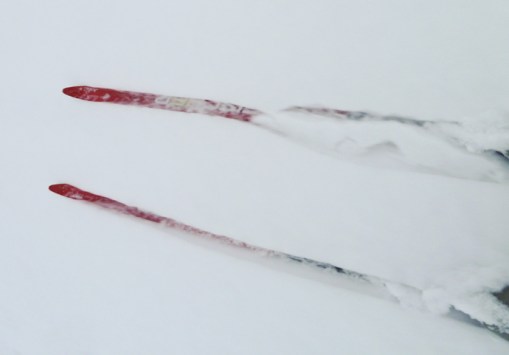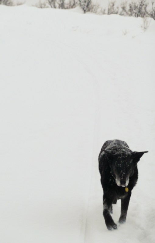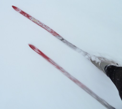 Neighbor Shelley asked me this afternoon if it was alright if she started some classic ski tracks across our hillside. Oh Yeah. She and her dogs were soon scooting through the spindrift snow as more was coming down. A little while later I moved myself away from the computer and went in search of the old fish scale classic skis and the glide wax and then had to look for the poles before finding them out in the shop with a hoard of other ski poles. We could outfit a few skiers with our outdated equipment.