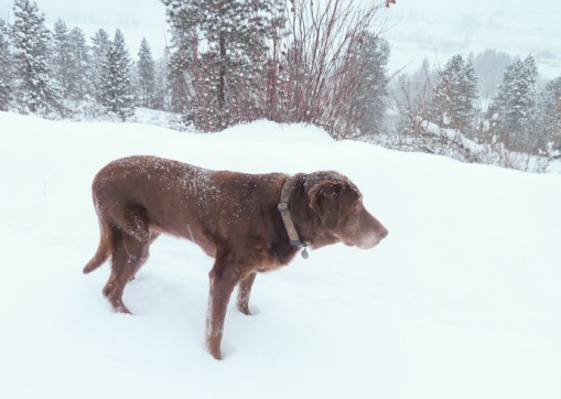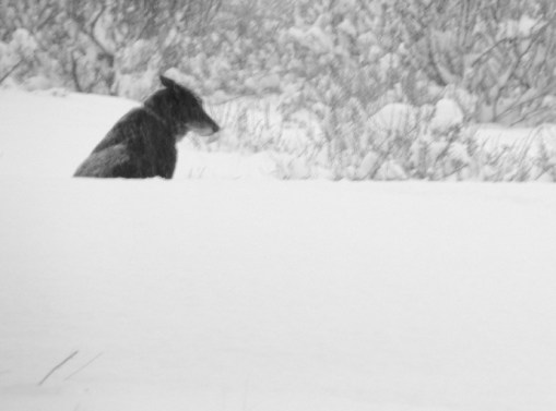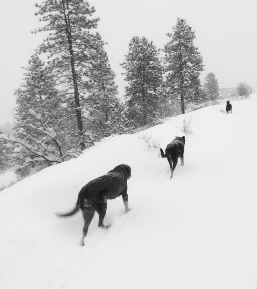 And the dogs wanted to go along. They already had a morning walk. And Luna and I had done some skate skiing in the soft snow at Big Valley this morning too. That was a real effort. So off we went, up our trail and then along the road to a vacation house where we found Shelley’s tracks coming from the other side of the hill. It was a bit much for Sam, the brown dog, so I thought maybe a shortcut back home would be a good idea. It was quite a pull up a steep hillside but eventually the old dogs made it up and then we were on our regular trail heading downhill towards home. The dogs will sleep well tonight.