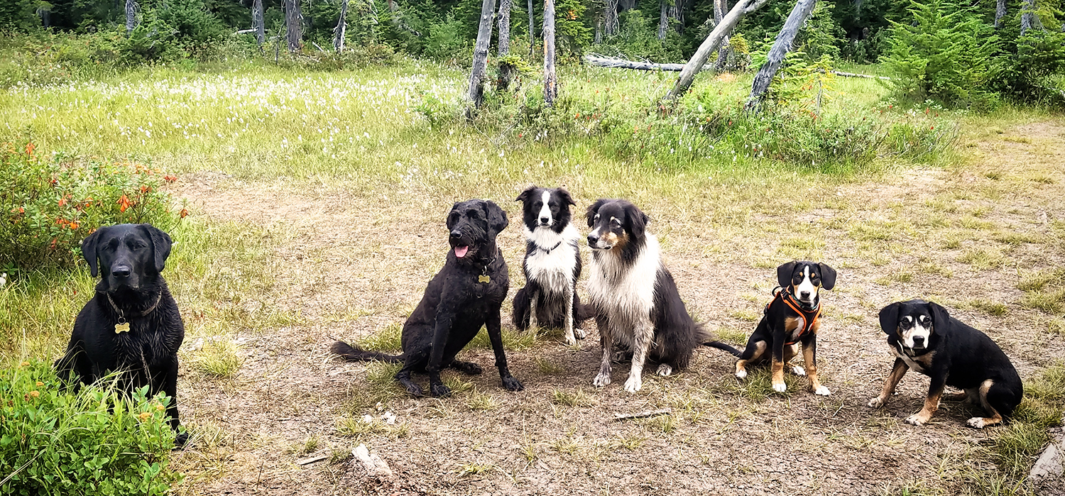 We hiked to Cutthroat Pass from the Cutthroat Lake side. It can also be accessed from Rainy Pass, following the Pacific Crest Trail (PCT). But there are no lakes going that way. After some hot days here in the valley it was a refreshing 54 degrees when we started at the trailhead. Of course I was sweating by the time we got to the lake and the dogs were grateful for the cold water. They didn’t stay wet long as we climbed out of the forest and into the open rocky country on the approach to the pass. Kristen, from Methow Trails was one of the bikers and she is known for her wonderful photos. I was delighted when she asked for my camera to make photos of me with my dogs! After lunch, the dogs and I watched the mountain bikers descend and then walked quickly back to the lake. Sky was ecstatic. Luna was tired and she joined me, sitting in the shade nibbling on native huckleberries. After the 11 1/2 mile round trip they both slept all the way home.