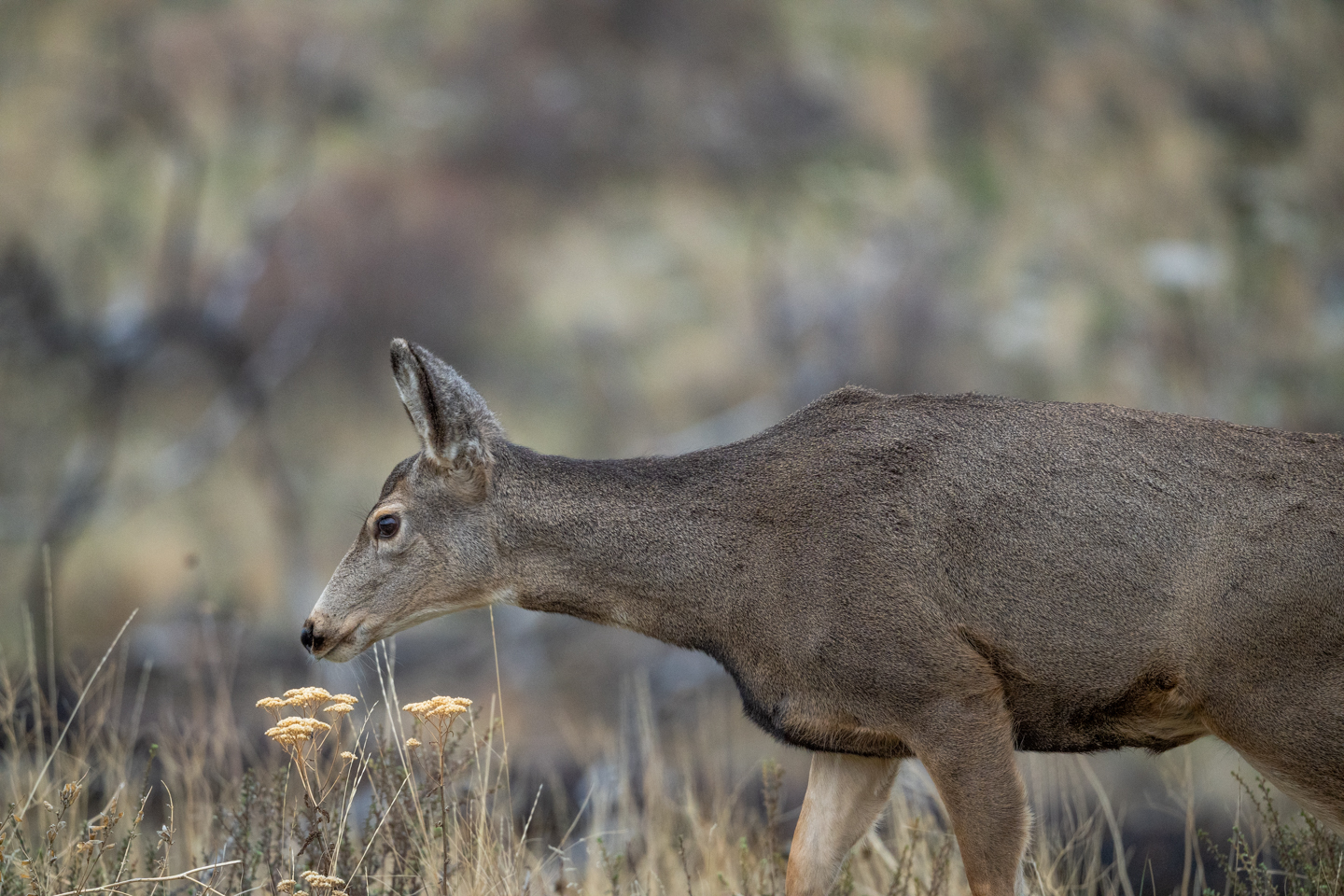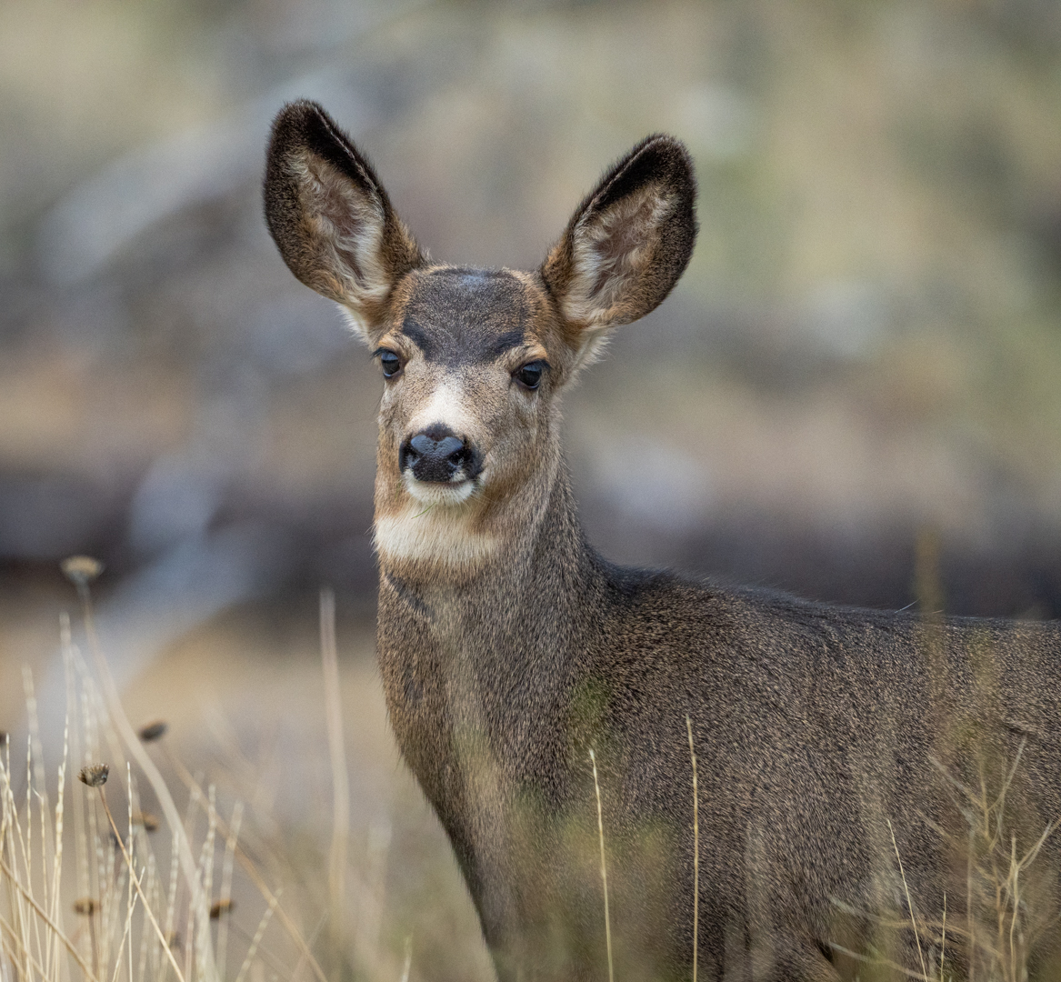 Mule deer honestly earned their name with ears that rival a mule’s. This small group of four to six does and fawns is often seen on our hill. And they see us. And they are not afraid. They know we, including Willow, will not harm them. In fact, one big doe, in the last photo, has been known to stomp her feet and act threatening to us. We give them a wide berth. This particular day, they were grazing around our parking area and not in any hurry to leave.
