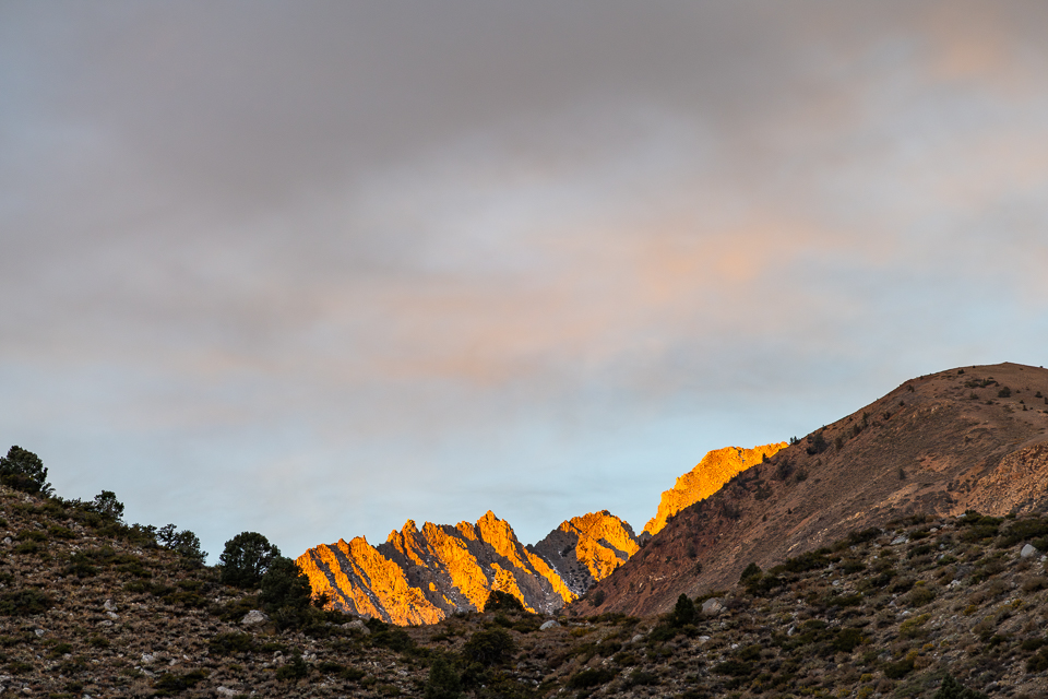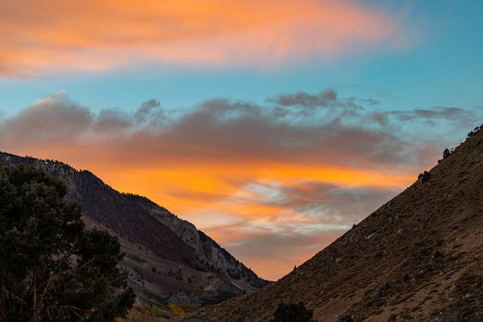 The girls and I recently returned from a two week road trip to the eastern Sierras. We met up with Willow’s sister, Juniper and her buddy Gus along with Mary and we all had a grand time. Willow and Juniper ran and played til they nearly exhausted themselves. Gus and Sky were relieved that they had each other. Mary and I enjoyed photographing morning and night skies along with lots of trees! Here is sunrise at our first campground in the Sierras.