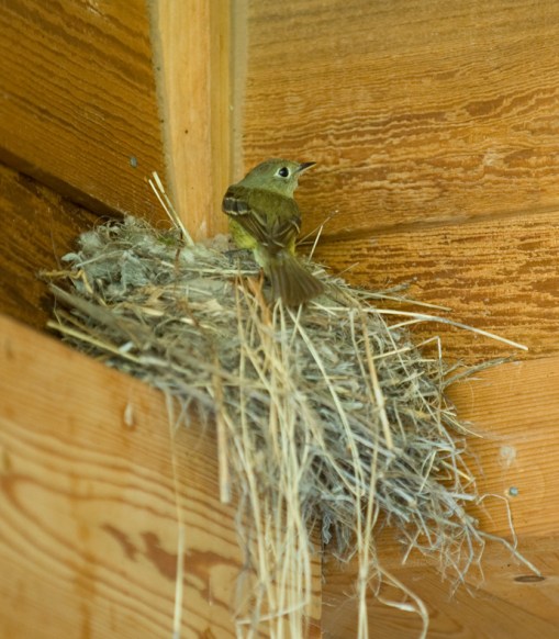 From someone who knows these birds better than me: Lots of yellow on the belly during the breeding season, strong eye-ring with a bit of tear drop look, large and wide bill with orange lower mandible, and the nest is on a building (probably lined with moss or lichens) means ‘western’ type, probably in our area Pacific-slope although there is a possibility of Cordillean Flycatcher here as well.