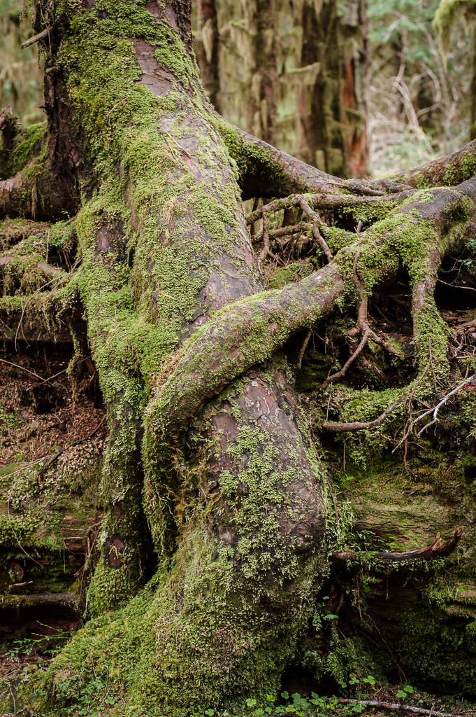 According to the Olympic National Park website, the rain forests of the Olympic Peninsula are some of the most spectacular examples of primeval temperate rain forest in the lower 48 states. These rain forests once stretched from southern Oregon to southeast Alaska, but little remains outside of protected areas. The region gets 150 inches of rain every year and with moderate temperatures trees grow amazingly big. And there’s not just trees. Shrubs and ferns and fungi of all types are prolific and often seen growing out of trees and dead logs. Some logs are known as ‘nurse logs’ and support an entire group of trees and other plants. We spent part of a day in the Hoh Rain Forest and were also able to explore a bit of the rain forest near Crescent Lake and along the coast.