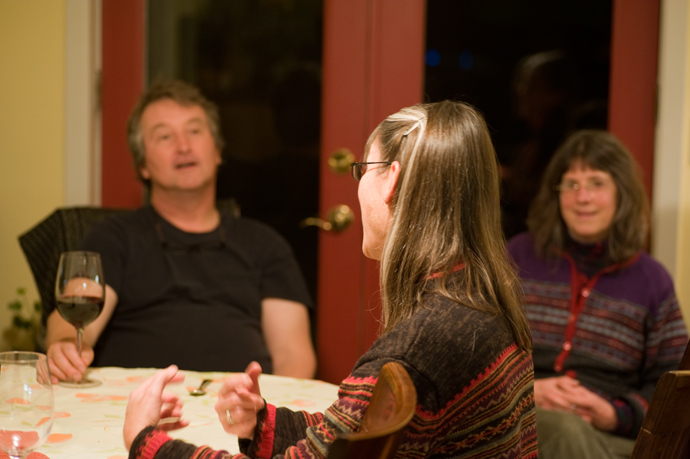 I’ve been busy the last two weeks – there was a lovely wedding to photograph out on the ski trail and of course lots of computer work following. And this week I needed to produce a newsletter too. Now that I’ve finished both of those projects I can go on to some personal stuff. The dogs and I have had a few walks with friends and one evening this week I got to take a pasta making class at Tappi, a wonderful Italian restaurant in Twisp. It was a small class – just five students – taught by the owner and cook who learned cooking from his mother. I love that he cooks by feel, not so much with recipes; that’s how I cook. He showed us some cookbooks but then went on to say he doesn’t use them although some were obviously old and well-thumbed through. For the pasta, he said one egg per serving and enough flour to absorb the egg. How much flour? Well that depends on lots of stuff – how big is the egg, how humid/dry is it, how warm/cold are your hands, and so on. For the three sauce he showed us, he gave us a list of ingredients and approximate measures and then he showed us how he makes them in his own kitchen. There was Emma’s (his mother) , Diavolo (the devil) and Carbona (yes, there was bacon in it, lots of bacon) sauces. And the best part of a cooking class is the eating! To go with the three pastas, he fixed us a lovely salad with a nice chevre and roasted buttercup squash and red onions from the brick wood-fired oven and it was all paired with wonderful wines from Italy. By the time we finished eating, well after 9 pm, I think everyone was very satisfied with the evening.