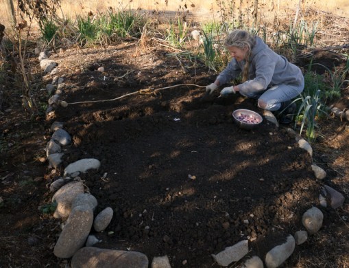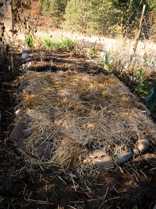 The garlic is planted and fertilized with horse manure from the base of Patterson Mountain and mulched with straw from a demolished straw bale building up in Lost River.