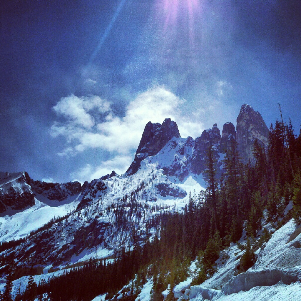 Today Highway 20 across the North Cascades opened for the summer season. It’s been closed since last November. In recent weeks people have been riding bikes up it, enjoying the traffic-free sunny days as they grind up the mountain. At noon, all that changed. The sound of Harley’s filled the air and RV’s trudged through town. It’s good for business but it does change the way of life in Winthrop and Mazama. For the first time ever, I decided to drive up on opening day to see the big cut snowbanks and enjoy the mountain air. But first, Luna and I went for a bike ride at Big Valley, where just weeks ago, we were skiing!