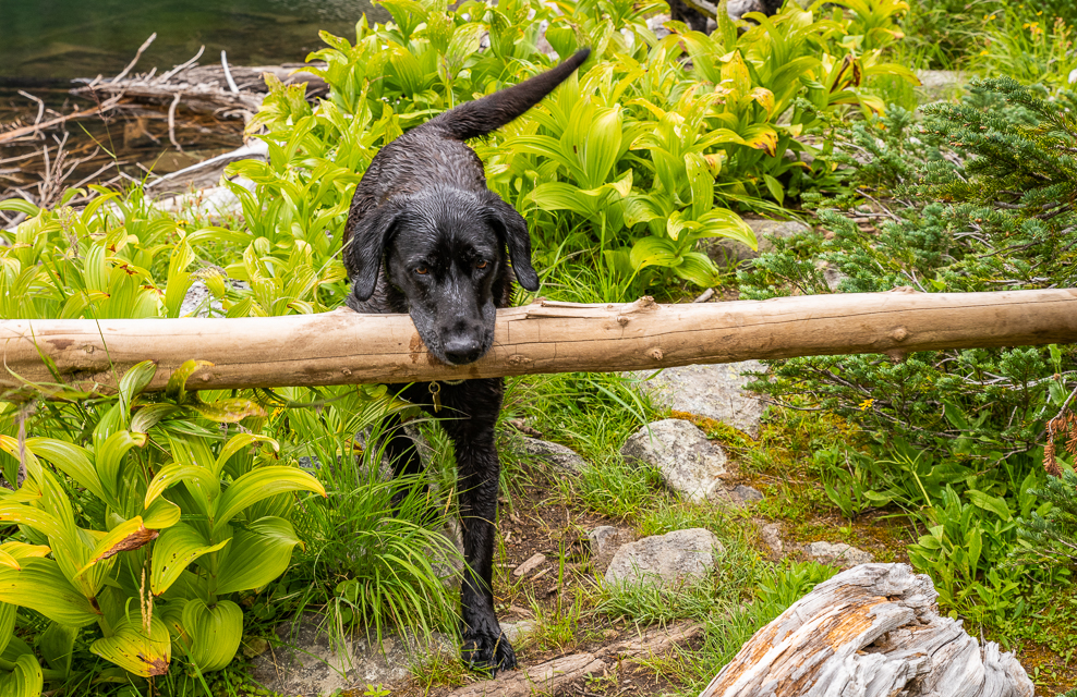 Since Luna can only tolerate short hikes on cool, preferably cloudy, days we have to pick and choose where and when we go. This four and a half mile hike was quite pleasant and the sun gave way to mostly overcast skies so she could enjoy it. Sky was ecstatic to be out in the woods with a lake as our destination. She also enjoyed picking her own huckleberries. I did too, only picking as many as I could eat along the trail. Luna was happy to smell all the smells and drink from small streams. She doesn’t seem to get in front of the camera much anymore. I will have to work on that.