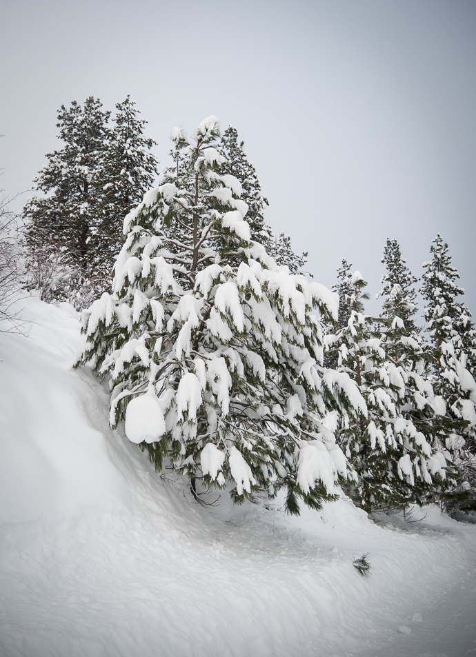 Luna is tired out walking on the trail. She no longer leaps and plays in the soft snow.