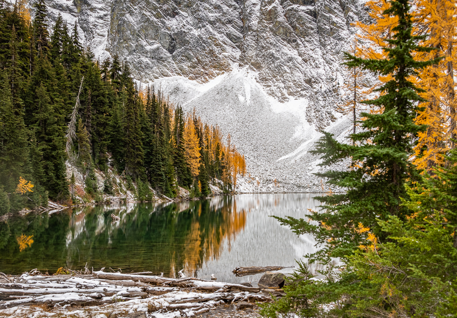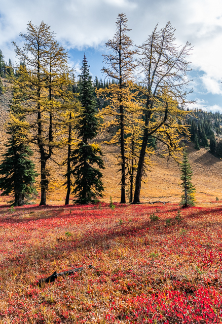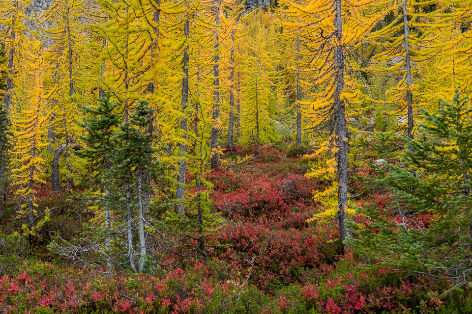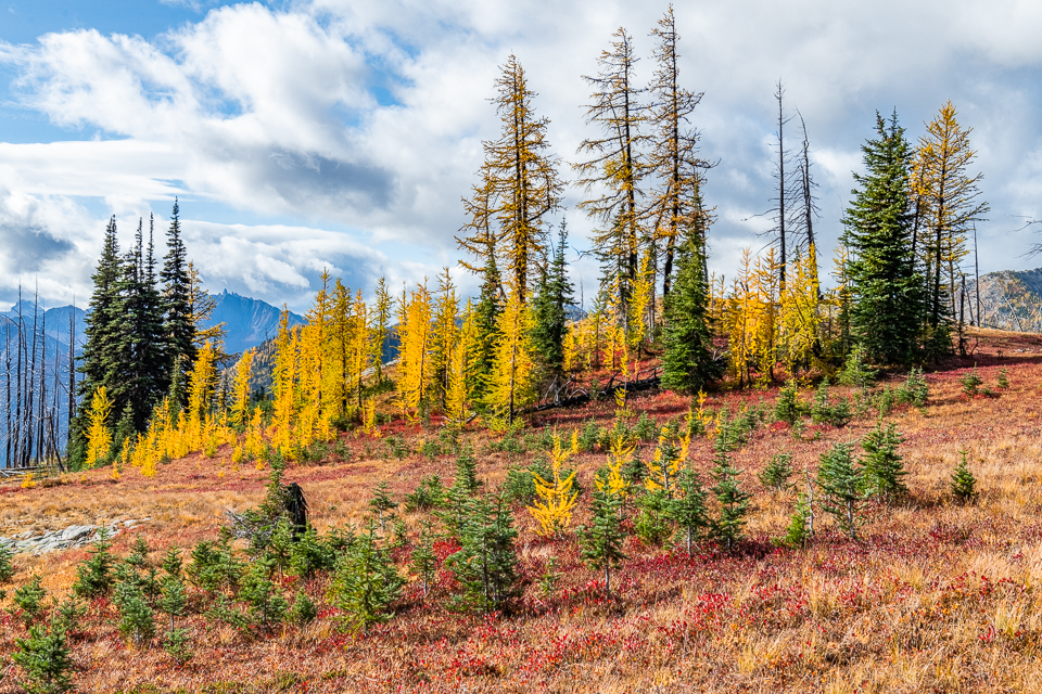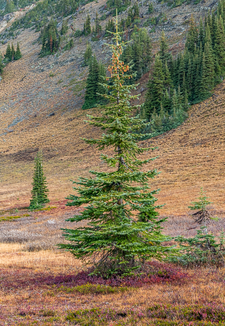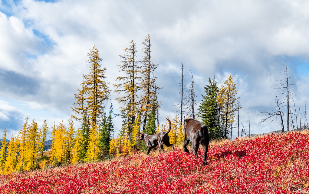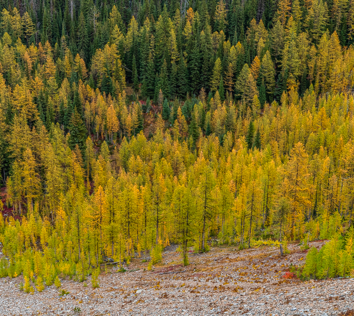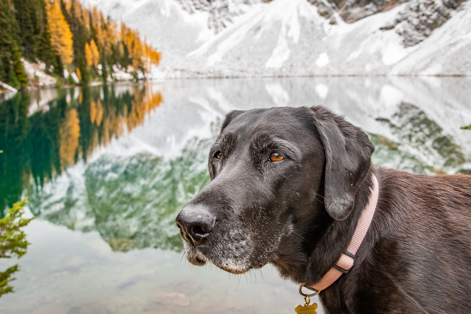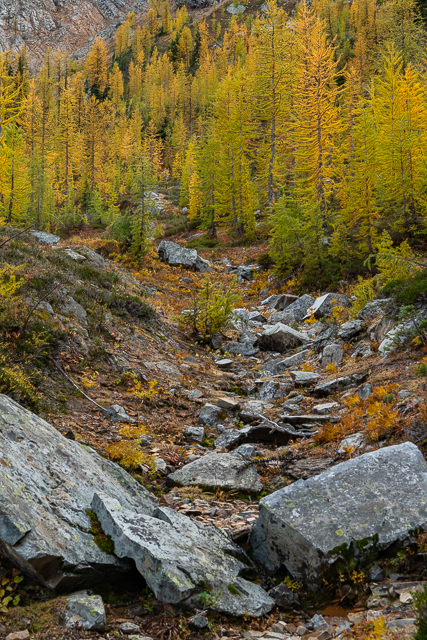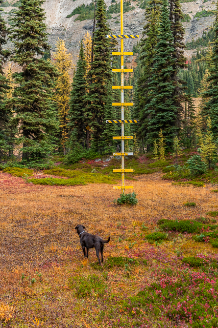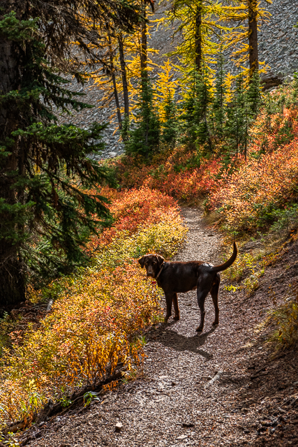 This is my favorite trail, I’m pretty sure. I can return to it multiple times during a hiking season. It does have the very worst road though. It’s a place where the sub alpine larches are enchanting in their early summer greens and amazing when they turn golden in the fall. Pikas are frequently heard and sometimes seen while crossing the talus slopes. Earlier in the year marmots let loose with piercing calls to frighten even the bravest dogs and people too. Now they are underground. The pikas continue to harvest greens to dry in their ‘hay’ piles and then store under the rocks for the long cold winter soon to come.