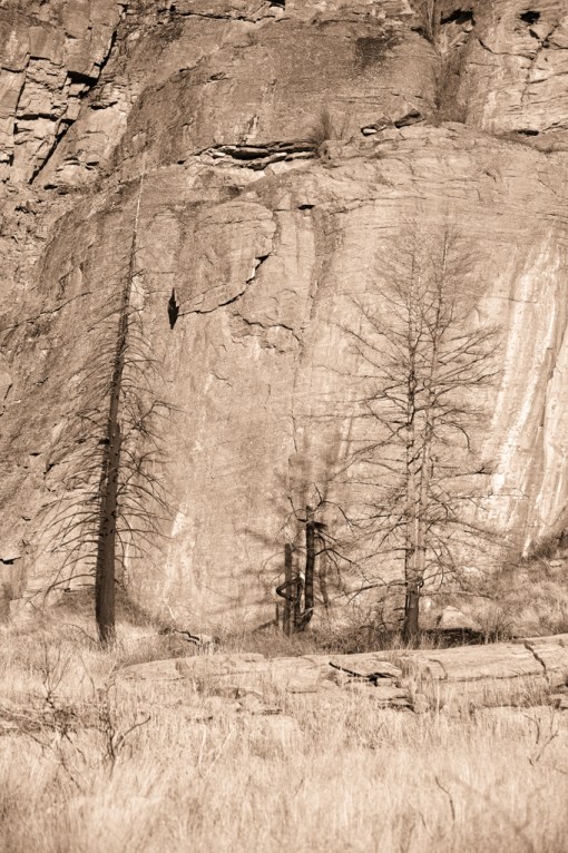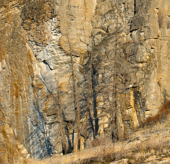 At this time of year, late afternoon is 3:00 p.m. Hardly seems right. With the low angle of the sun, it lasts a while making for some good photo opportunities depending on the location. Yesterday my friend and I went birding to the Okanogan and while we dipped on our target wintering species, at the end of the day we did find a new place to explore – McLaughlin Canyon. Ken’s told me about it in the past, insisting that it’s a place I’d like and of course, he was right. We stumbled upon it from the east, coming from Tunk Valley, going up and over a divide and then dropping into this amazing rock walled chasm. The late afternoon light colored the rock walls with oranges and yellows, shadowed by burnt snags from wildfires in the not too distant past. A tiny Canyon Wren completed the scene.