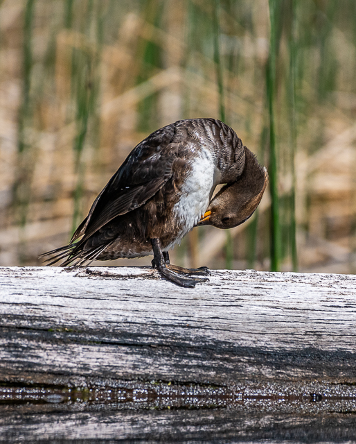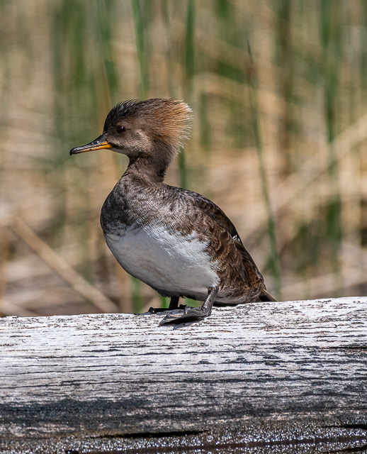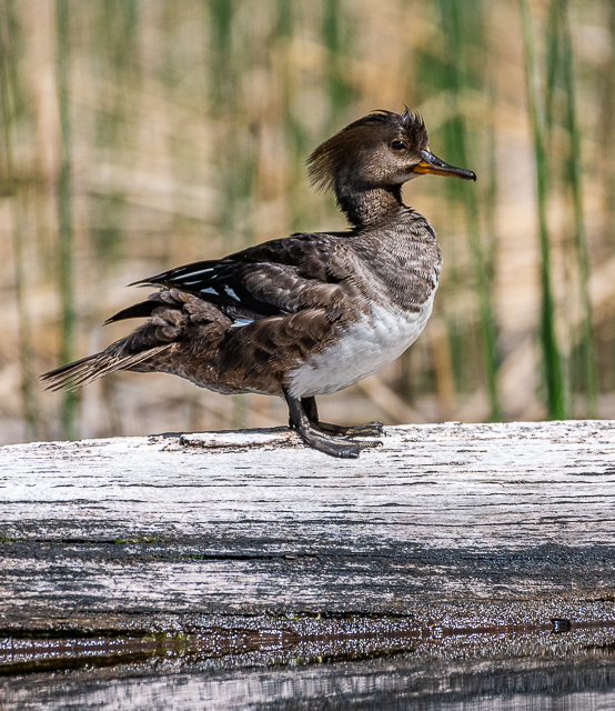 This female Hooded Merganser was pretty relaxed and let me watch her as she preened her feathers on a floating log near shore. After a while she decided, enough was enough, and flew away. She may have had a nest to tend somewhere around the lake.
