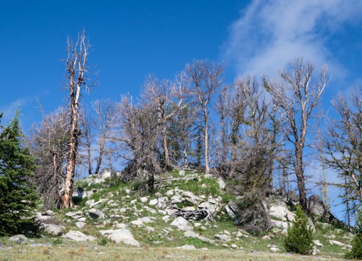 I think these are dead whitebark pines. Whitebark pines are in decline around the west for a variety of reasons. You can learn more about them here.