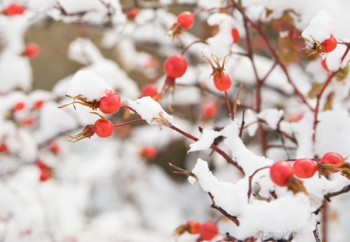Rosehips brilliant color and citrus taste make them especially attractive to birds. People enjoy them as well.