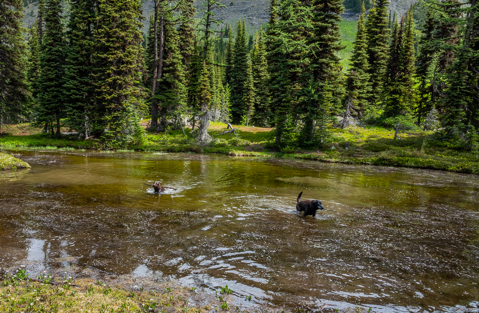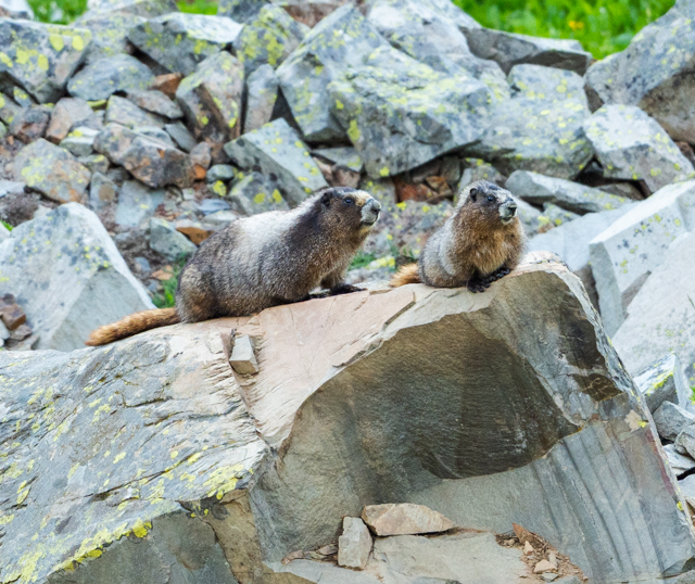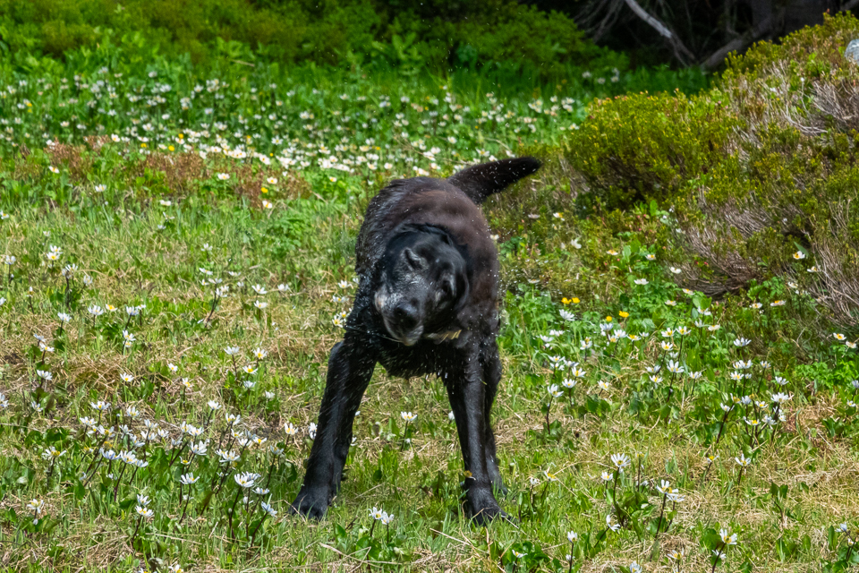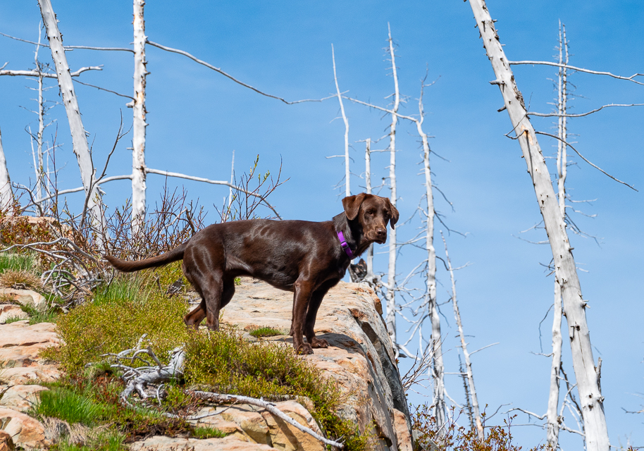 As I approached the top, I leashed Willow, the youngster, and kept Sky by my side. Soon I saw the goat walking down the trail towards us. I leashed Sky and we got off the trail to let him pass. But no, he was curious about us and peered over the edge where we were trying to be out of his way. I yelled and pretended to throw something and he backed off and then popped up in another place. Finally, he moved on and we went back to the trail. Of course, I didn’t see where he went. It was soon obvious; he was next to the lookout and stamping his foot and huffing at us. At that point, I figured we were not going to the top so we moved over to a rock outcropping and had a break, ate our snacks and drank some water. The dogs did not get off the leash. They were very aware of the goat and he continued to watch us, stamping and huffing but he did not move away from the mountain top. After our short break, we hurried down and away from him. The close ups of the goat were made with a 600 mm lens. We were not as close as it appears.