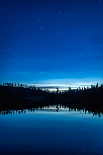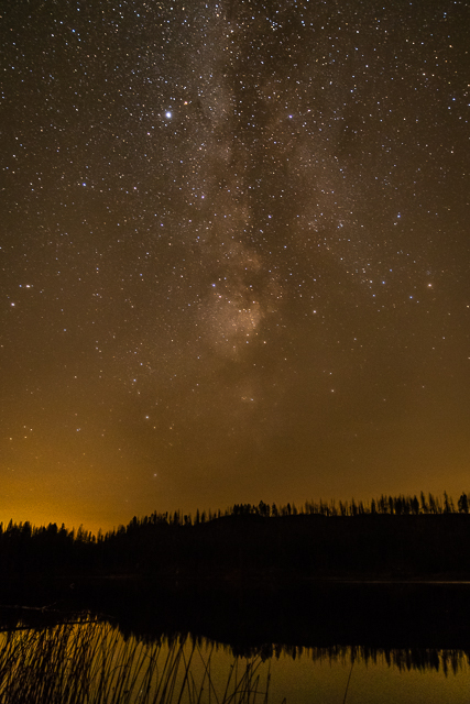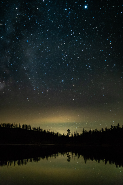 The stars put on a good show too. I had hoped to make a blue hour blend but the app I had in hand, gave me incorrect information. It said the Milky Way would rise over the lone pine tree looking west across the lake but that is not how it happened. It appeared almost due south instead. I started making images around 8:00 and continued til 11:00 pm when the Milky Way was getting dimmer and air glow was increasing. Still lovely. And I had a warm campfire I shared with Luna. Sky prefers to go to bed early.