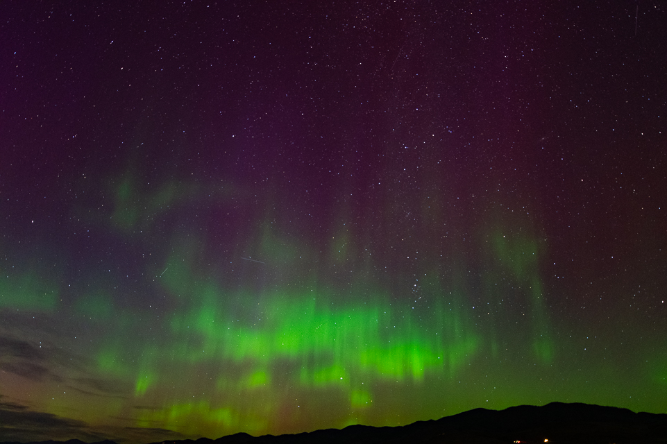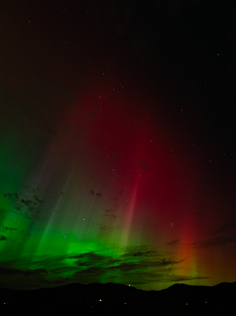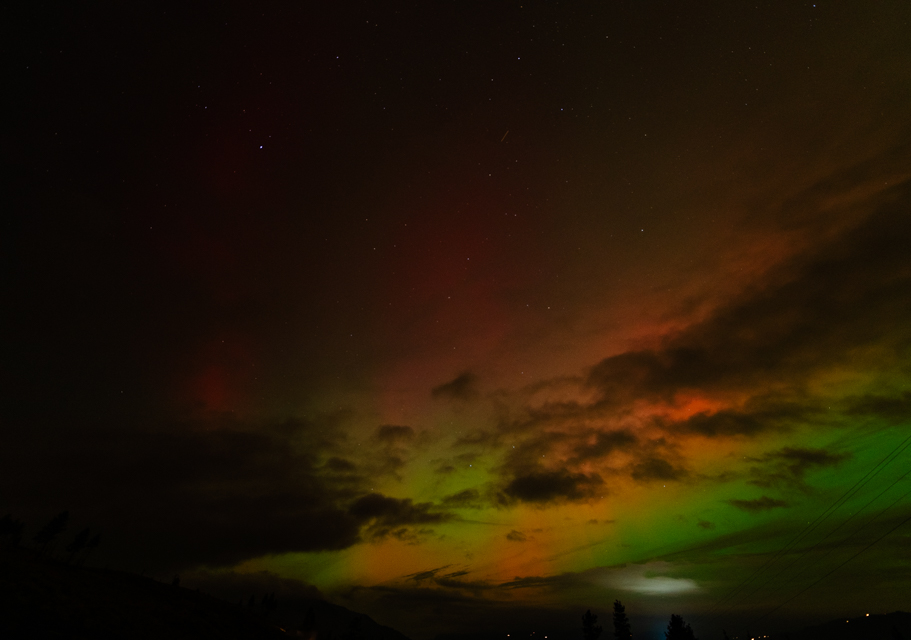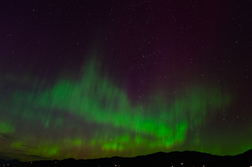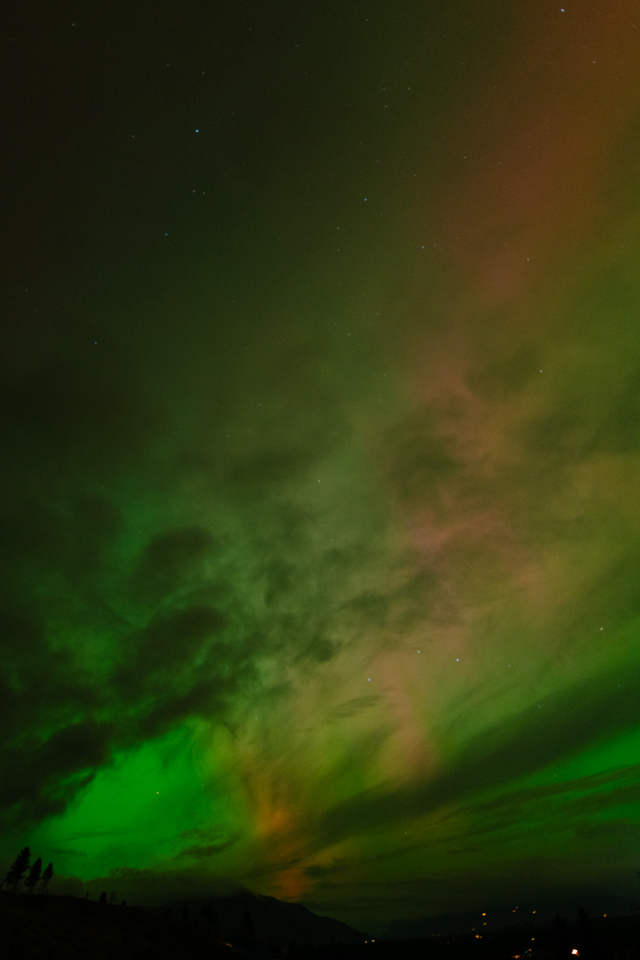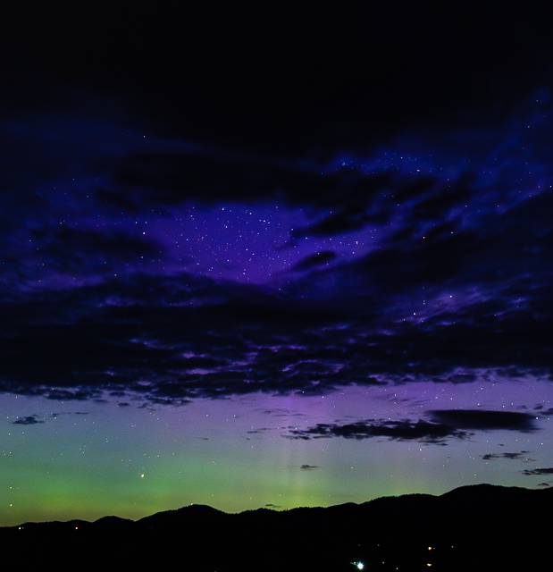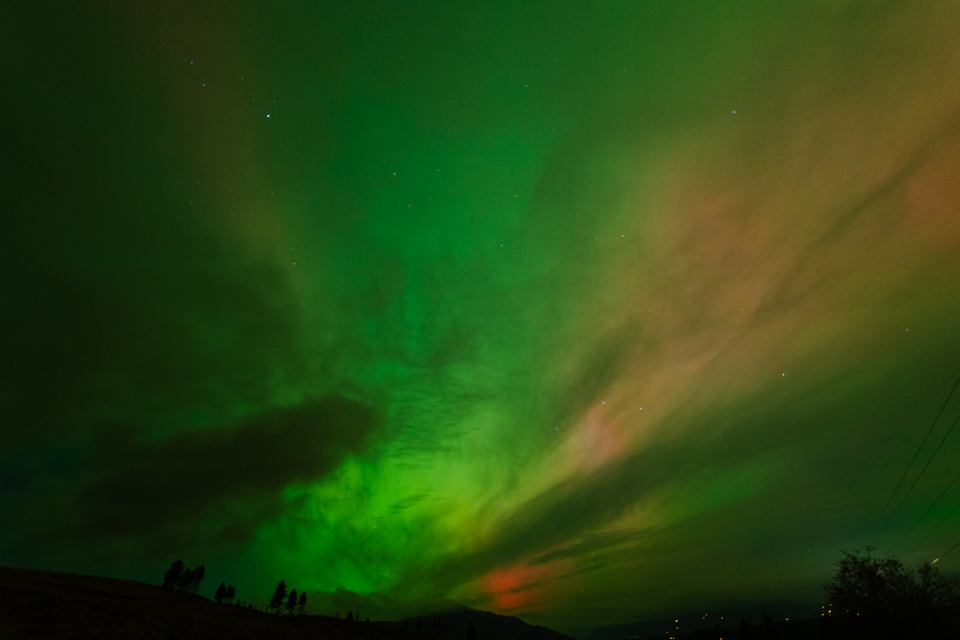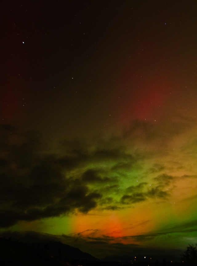Did you see the Northern Lights last night? I had seen predictions of a good show but a partly cloudy sky didn’t leave me too optimistic. I did get a camera and tripod out, just in case. Shortly after dark, a friend texted me an amazing shot of bright red color from her phone! I quickly found my warmest coat and put on some boots and grabbed the setup. I started with a 24-70 mm lens but quickly went inside for the 14-24 mm lens. The light show covered so much of the sky. I longed to be somewhere other than home where my view is cluttered with power lines, homes with all their lights burning and the infernal light of the Winthrop hockey rink. Sigh. Still, it was a great show, til the clouds rolled in.