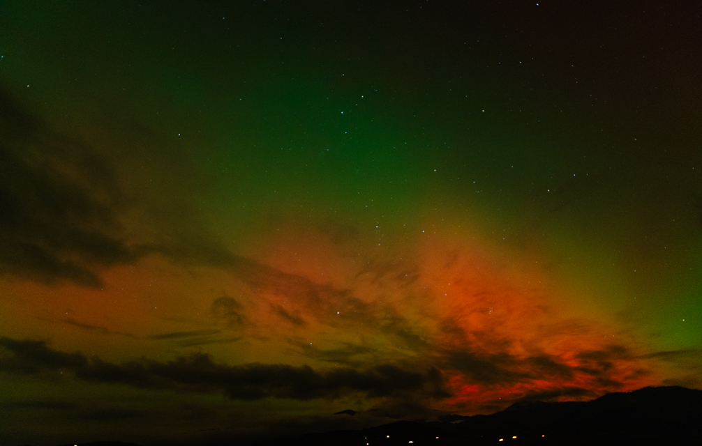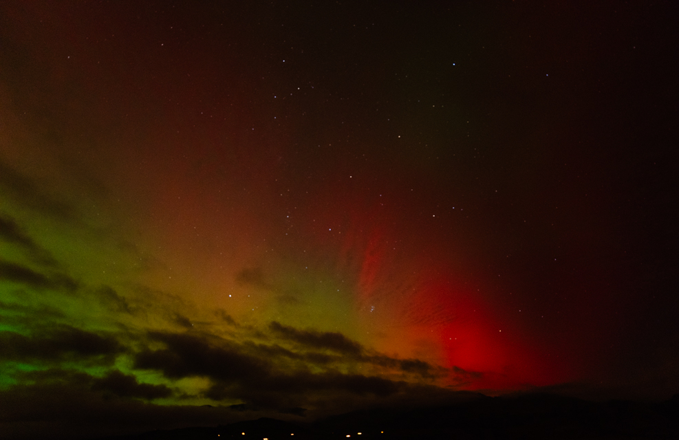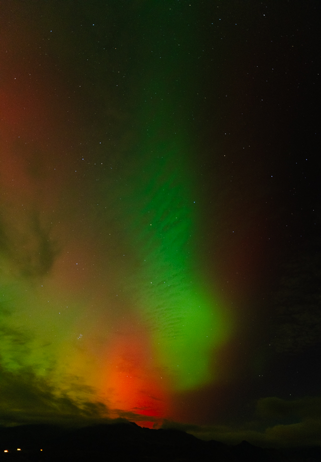 When I first got outside, the lights were pinkish with green but then turned more orange and red. The show started in the northwest, then moved across the sky to mostly north and then at the same time, they appeared to the east and southeast! Clouds added some real drama to the lights. The last photo shows the clouds illuminated from above by the Aurora and from below by the hockey rink.