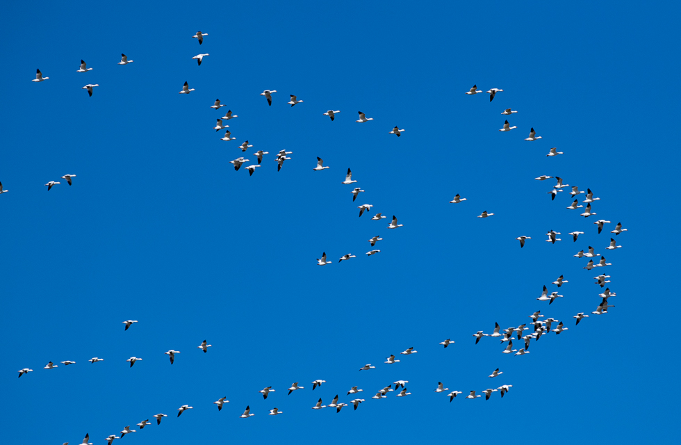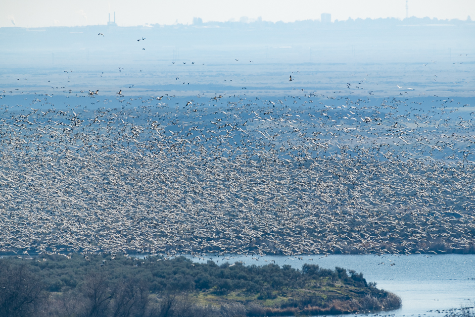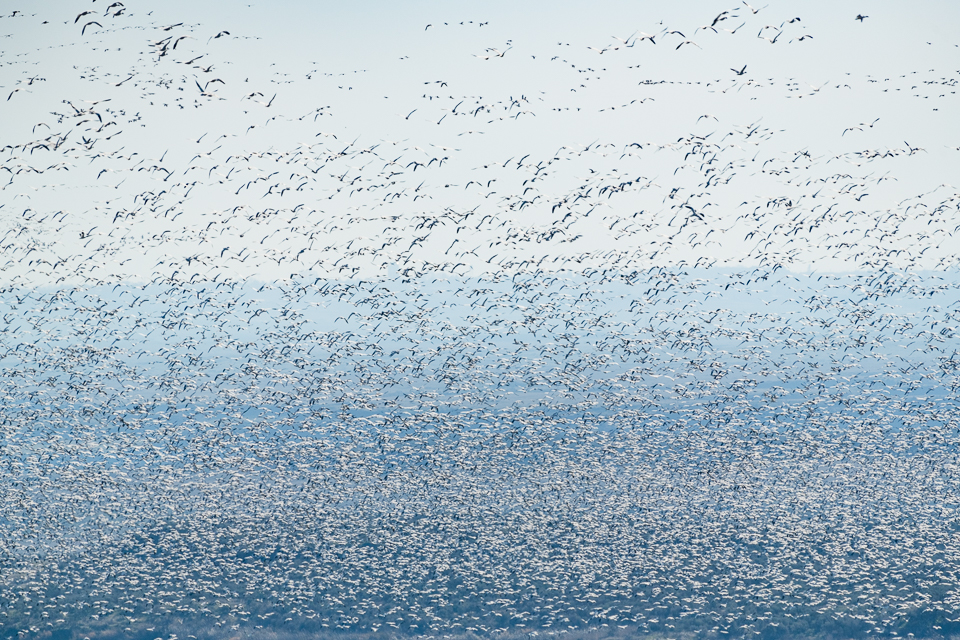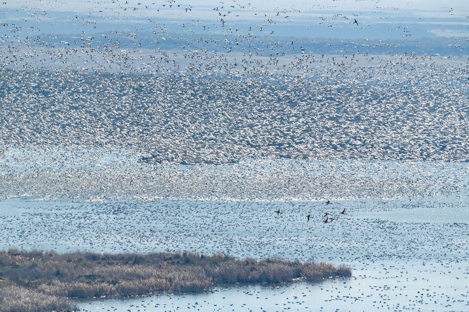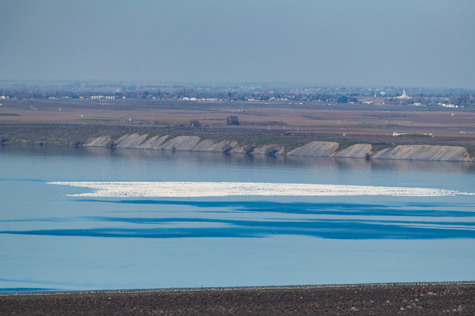 I first saw some Snow Geese when I crossed O’Sullivan dam, the structure that holds the Potholes Reservoir in place. They formed a dense white mat in the distance. I was able to photograph them from a hill above the dam. Later, I saw skeins of them flying overhead going north and south but mostly north. The next day, we made our way to Royal Lake and I was overwhelmed by the sheer numbers of Snow Geese and more were arriving from the south! I had heard there were about 50,000 of them but seeing this spectacle, I’d say there were far more. It seemed impossible to count them. In addition to the Snow Geese, there many 1000’s of Northern Pintails and other waterfowl on the water.