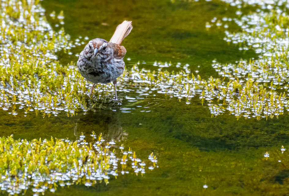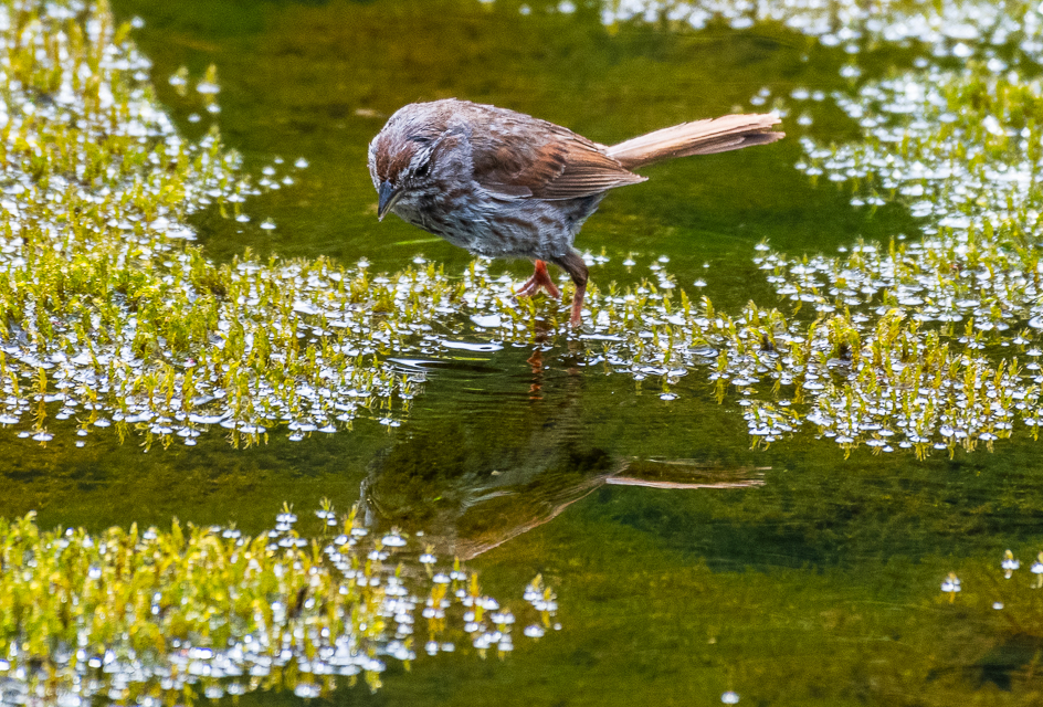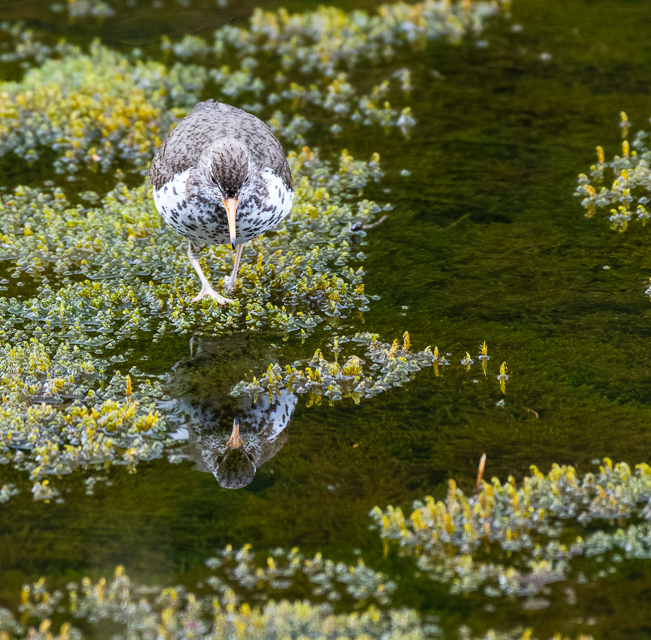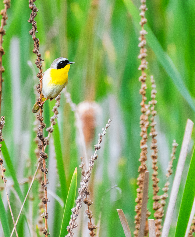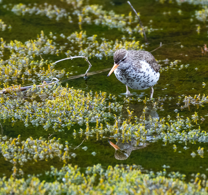 As I watched and photographed the Virginia Rail family (see last post), there were other birds singing and foraging in the marsh. I heard the familiar song of a Willow Flycatcher and was delighted to see it out in the open where I could easily photograph the tiny Empidonax flycatcher. If it had not been singing, I would have struggled with the ID. Song Sparrows were hopping along on the algae mats, foraging for what, I don’t know. There were three or four of them and some were probably young of the year. A Spotted Sandpiper joined the group, also foraging on the algae mats. And last, but not least, a Common (not so common in my mind) Yellowthroat sang from a prominent perch, giving me great views. Most of these images are heavily cropped as the birds are small and not that close.