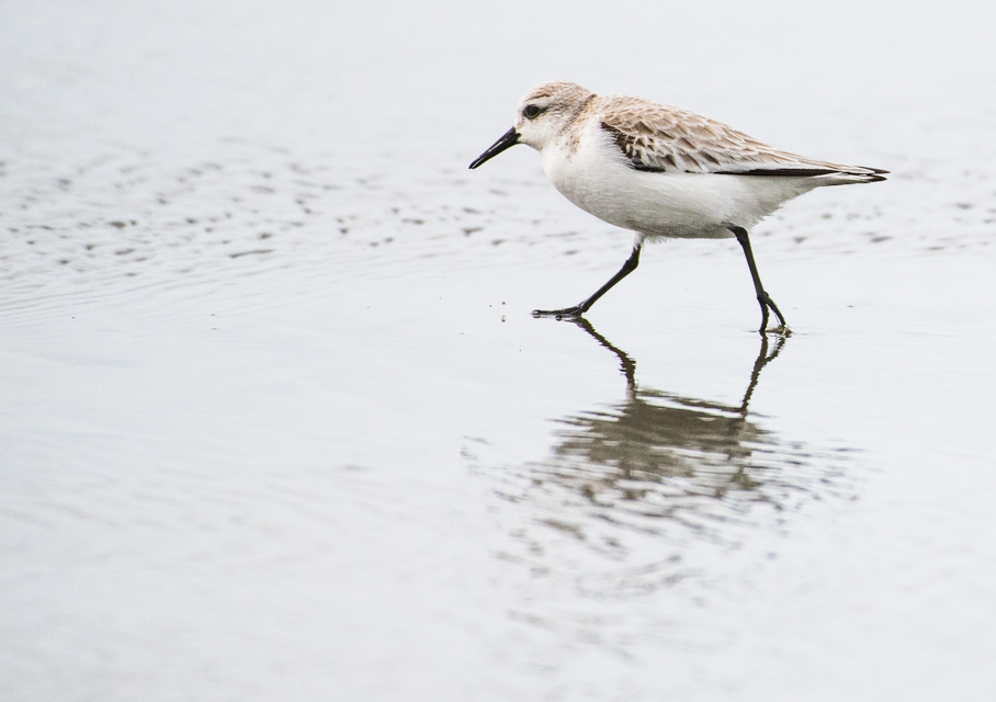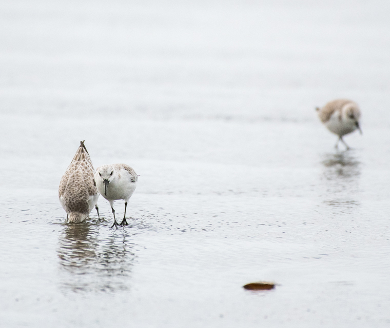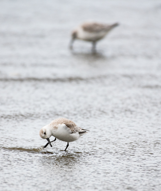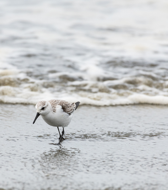 Sanderlings are small shorebirds widely distributed around the world. They nest in the arctic tundra and winter on temperate and tropical sandy beaches around the world. They feed by running down the beach following the waves and collecting small stranded animals or probe for prey hidden in the sand.