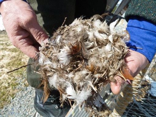 Here is a beautiful swallow nest lined with soft feathers. The adults collect these feathers to provide a cushy setting for the eggs and babies.